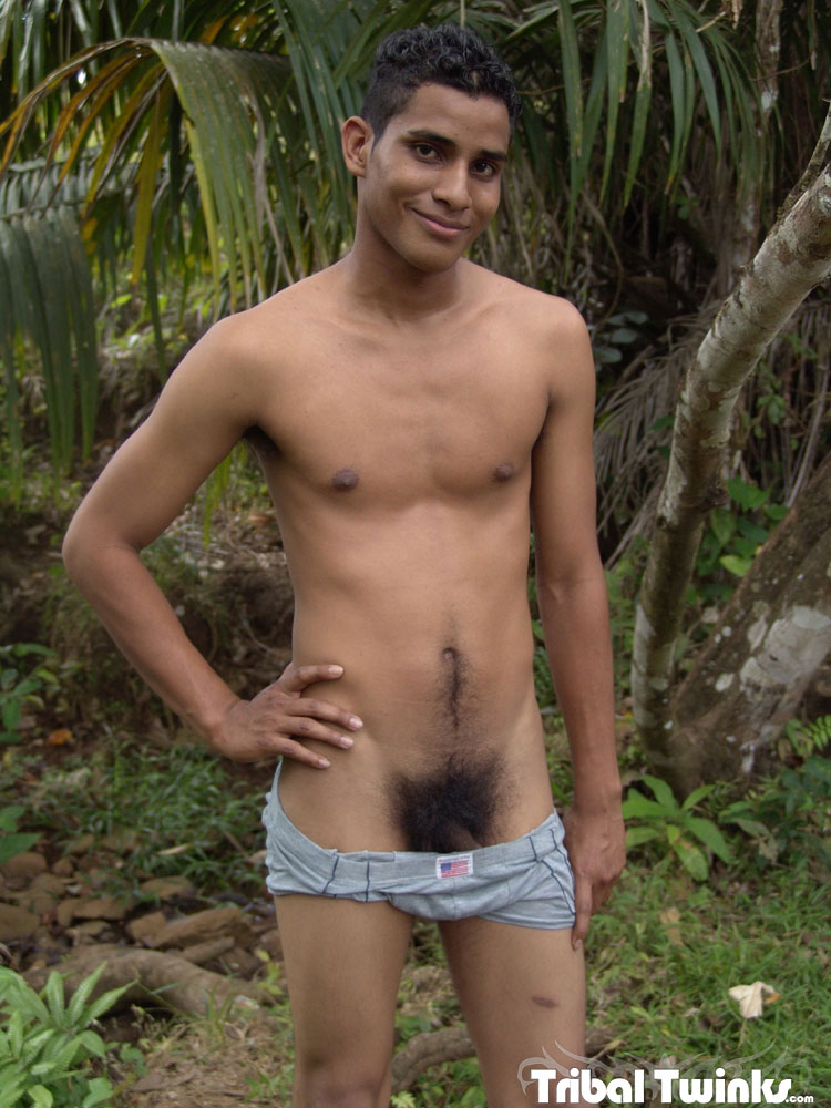 Tribal twink strokes his dick in the jungle