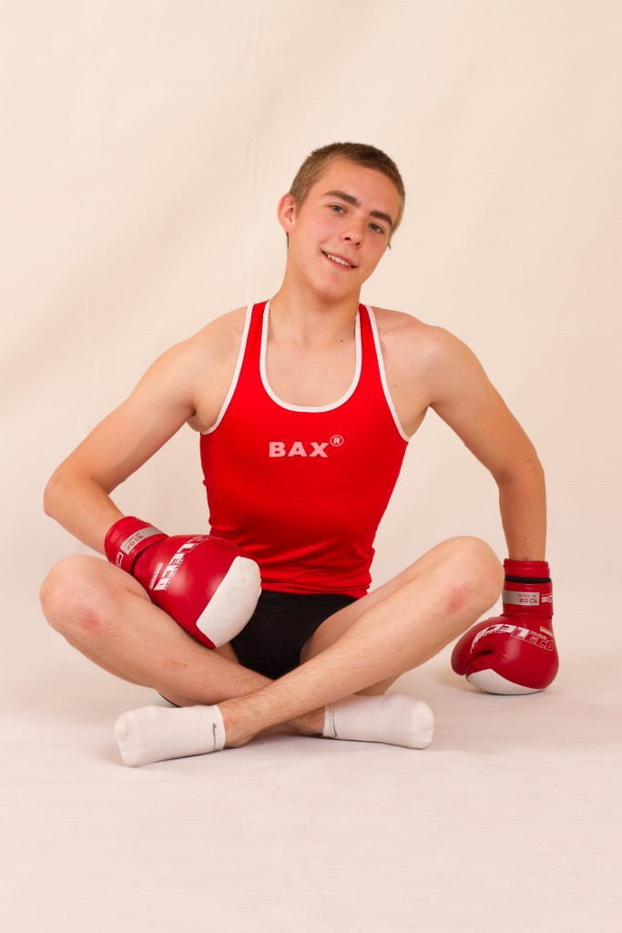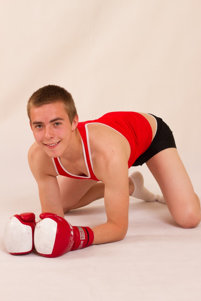 Sporty straight Eugene Small posing in boxing gloves