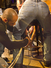 Andrew tied over a bar stool and each member of the crew take a turn on his ass