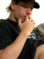 Rosy cheek twink Pat Drone stroking his uncut cock.