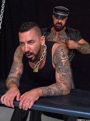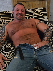 Marc Angelo is a beefy, hairy, muscled hunk with tattoos and a bad-ass